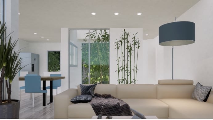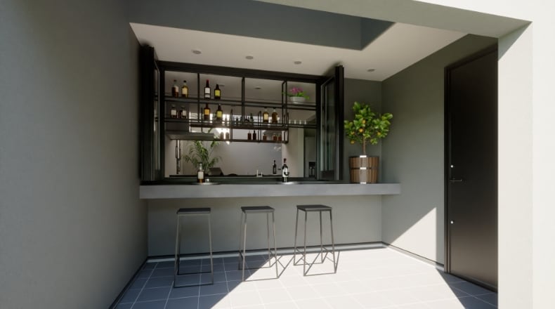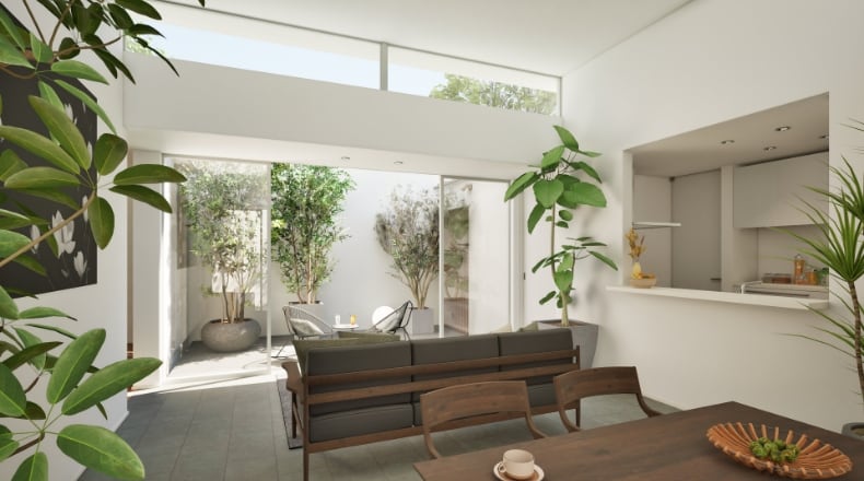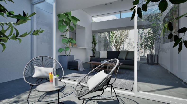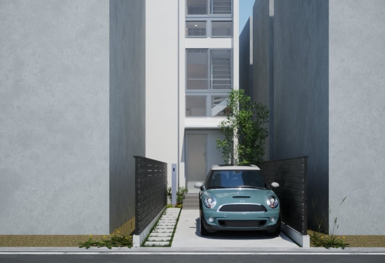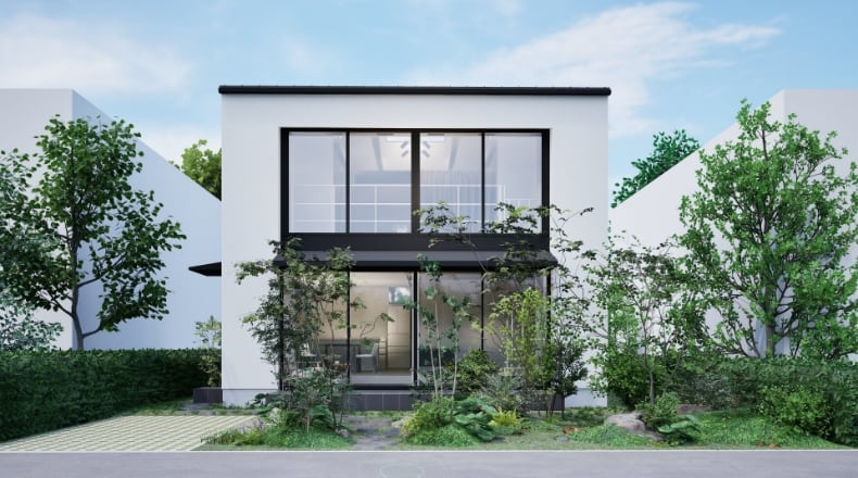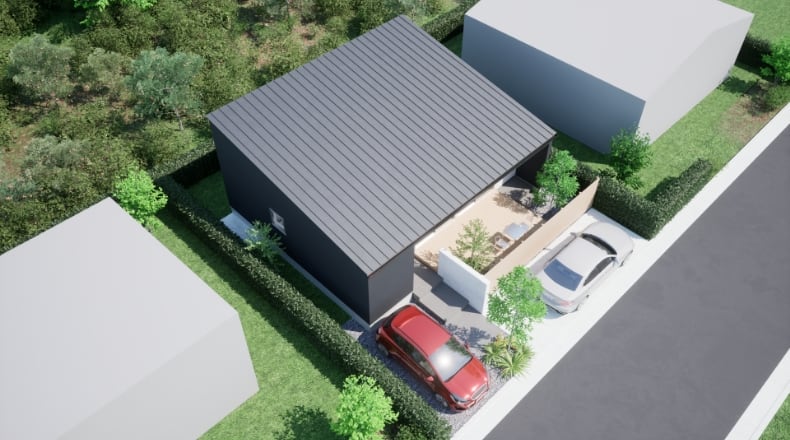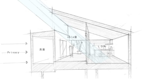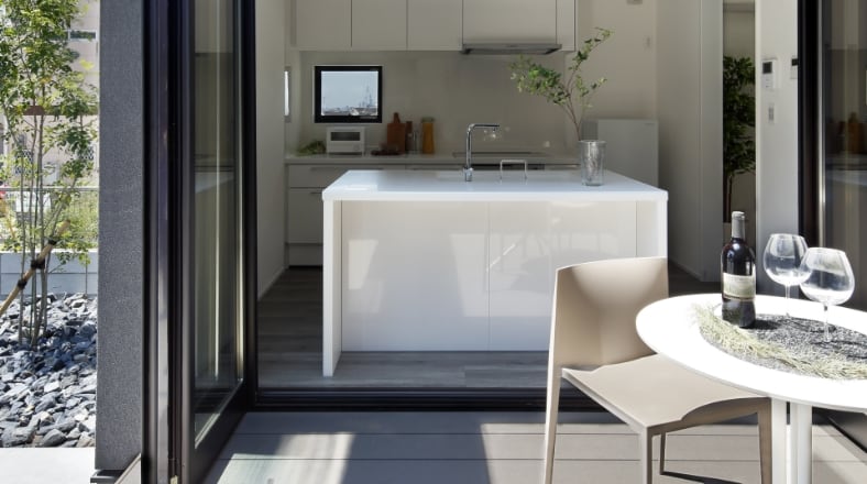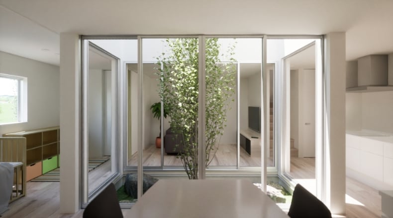 キッチン、浴室、リビングに囲まれたhaco庭。