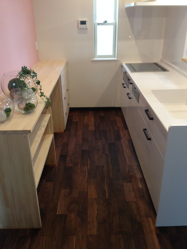 A様邸はリビングやダイニングのウォールナットの床に目を引かれます。