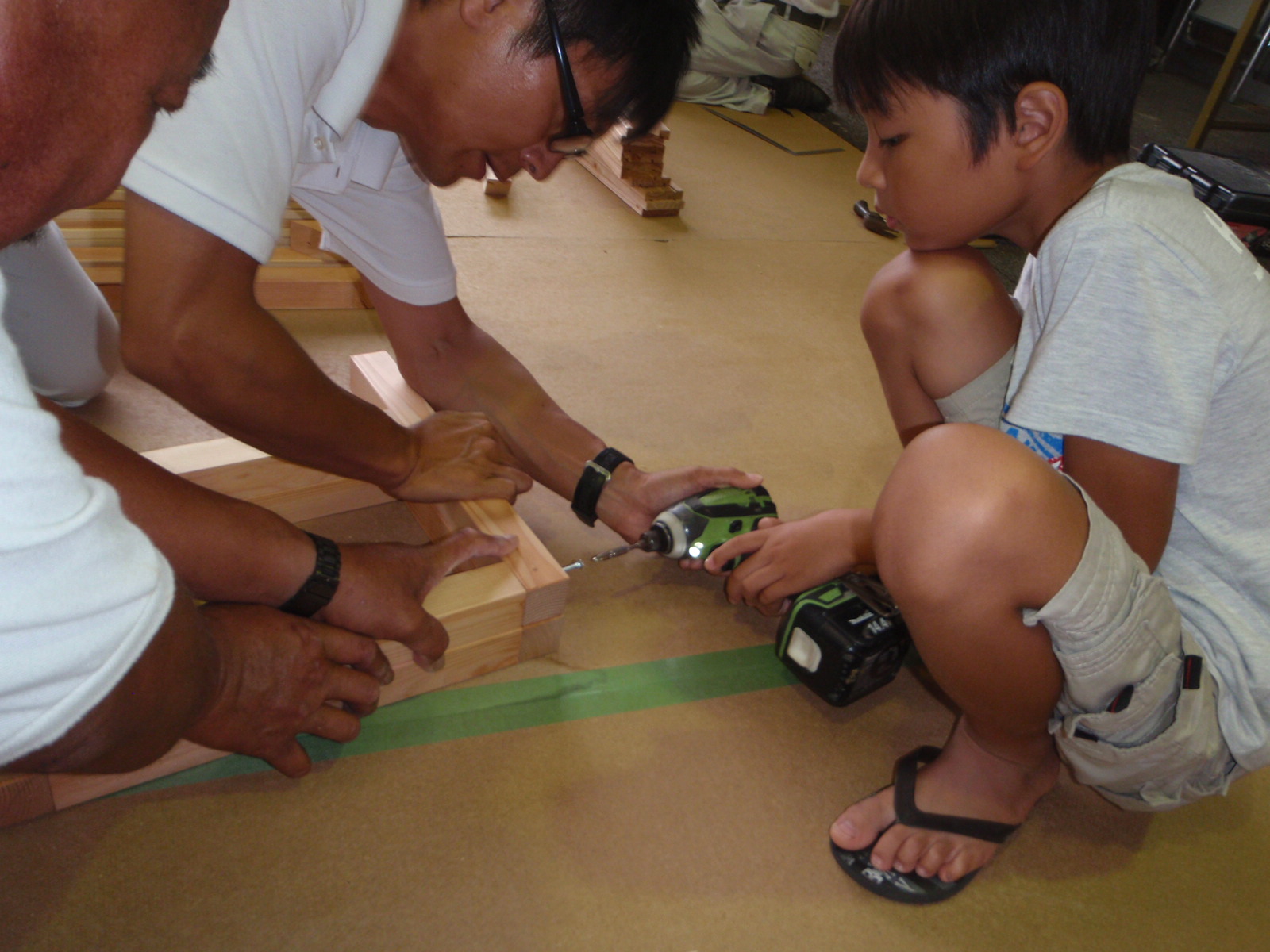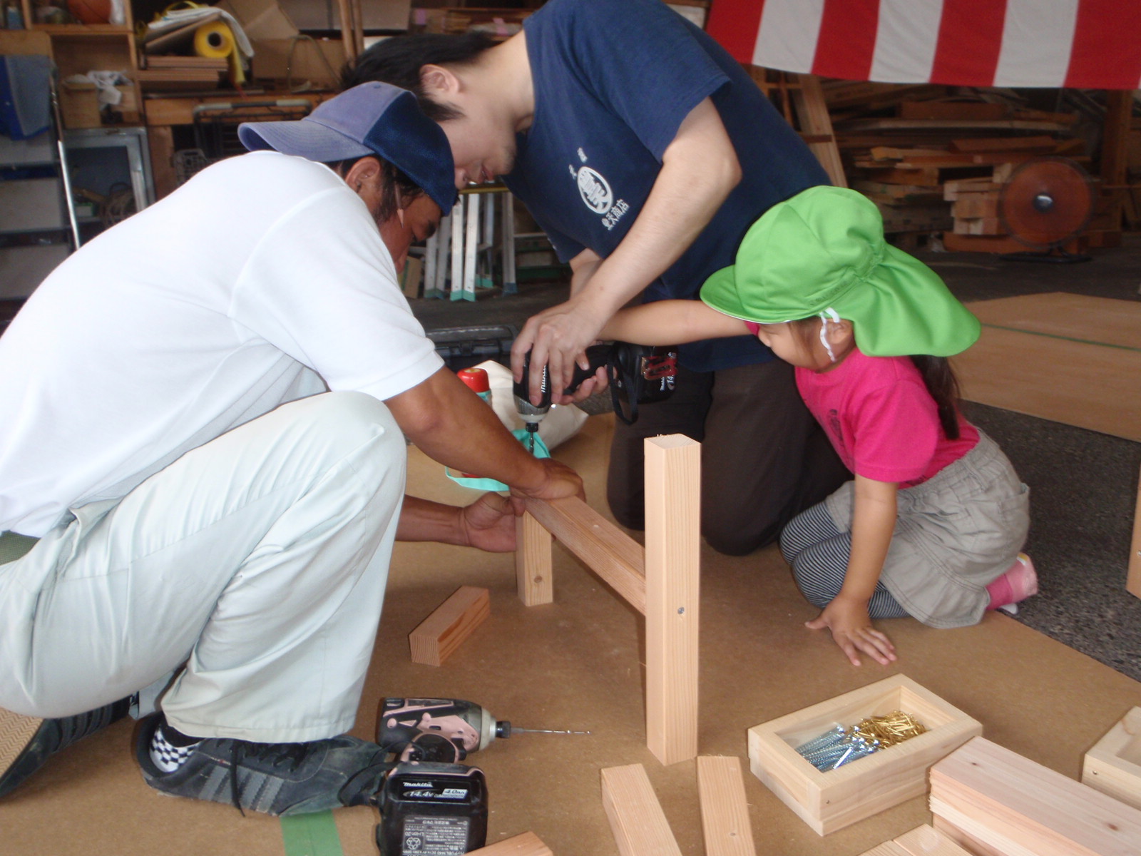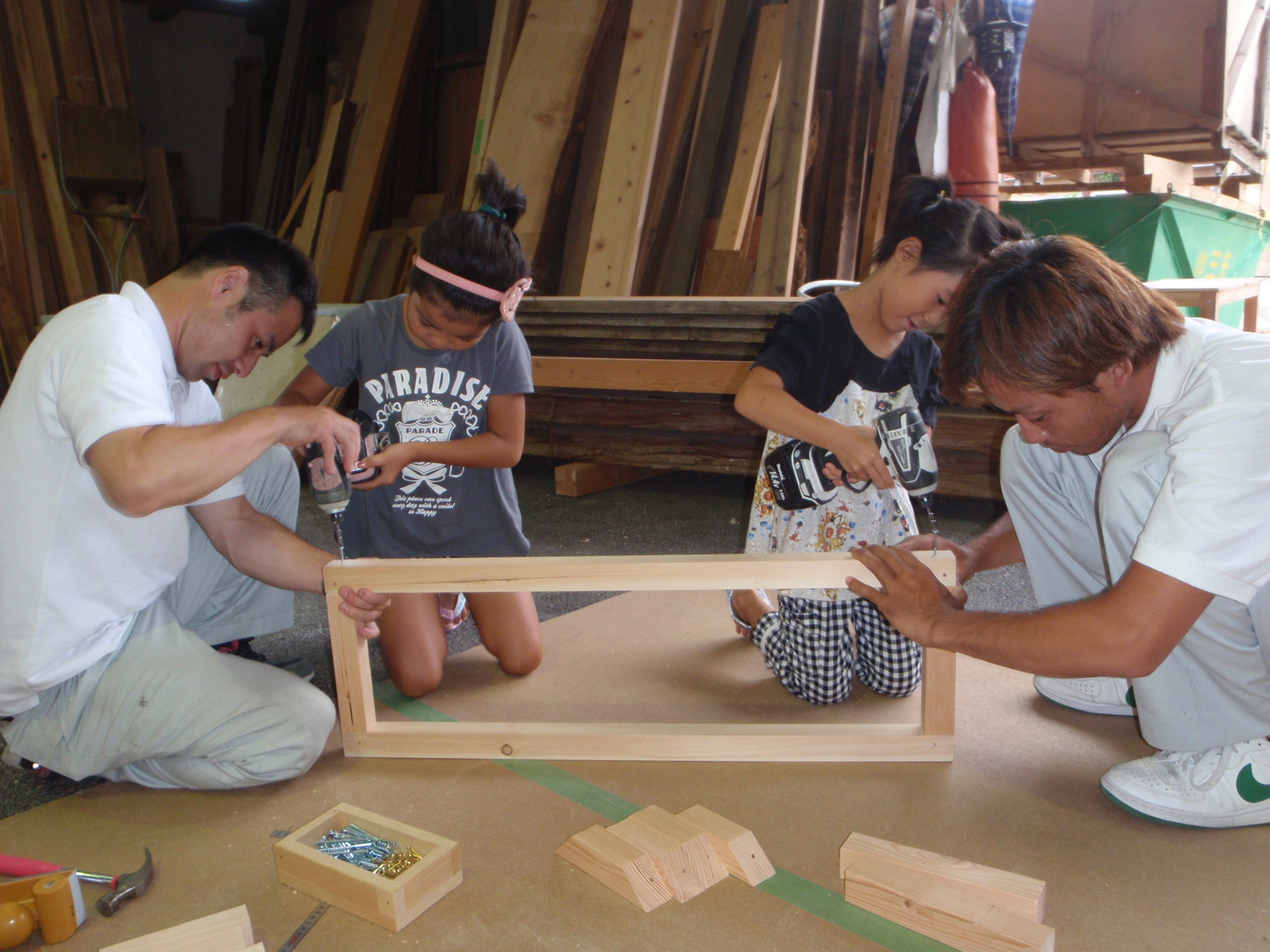 あらかじめ材料は揃えてあるのですが、ねじの穴をあけたり、部材がずれないように押えたりするので、