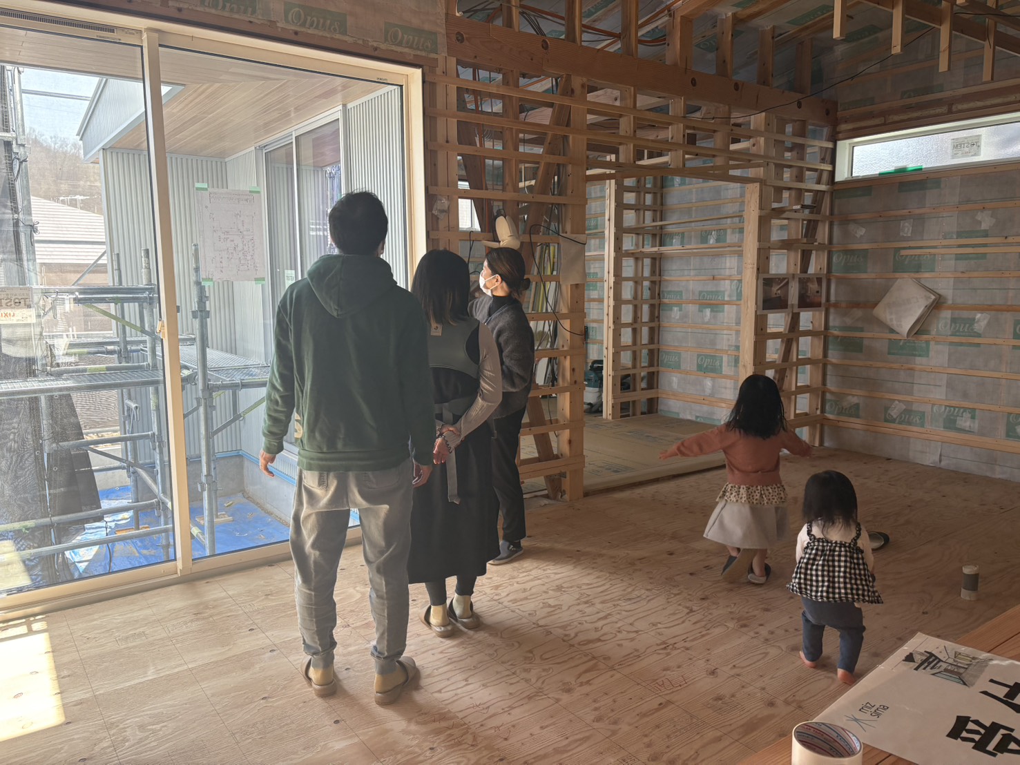 前回は、完成後には見ることのできない構造や断熱といった“家の中身”を見ていただき、今回は工事が進み、更に下地や壁材、電気配線など普段は見る事の出来ない部分をみていただける特別な見学会です。